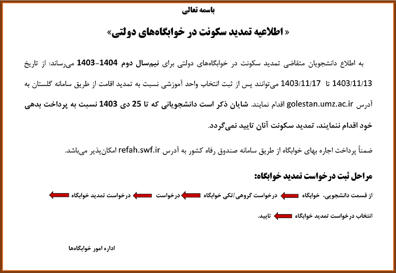 اطلاعیه تمدید سکونت در خوابگاههای دولتی - دانشگاه مازندران