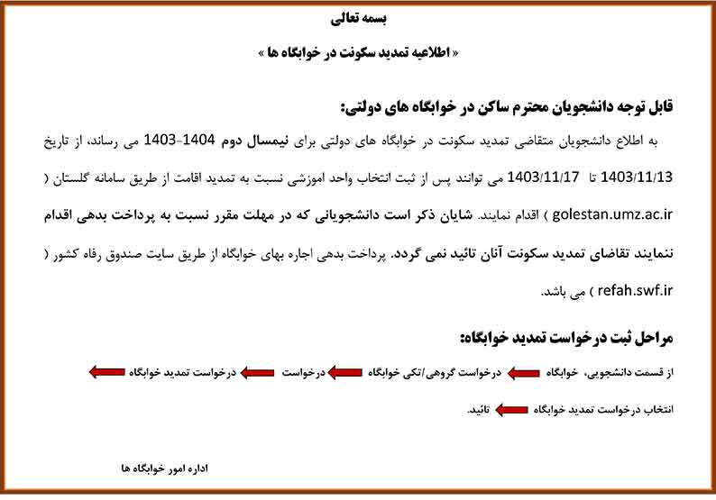 اطلاعیه تمدید سکونت در خوابگاه ها - دانشگاه مازندران