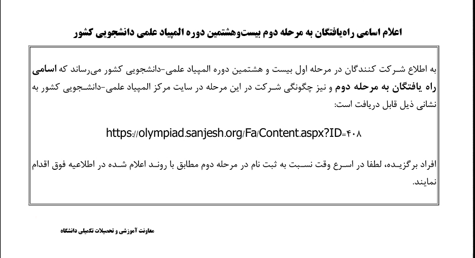 اعلام اسامی راهیافتگان به مرحله دوم بیستوهشتمین دوره المپیاد علمی دانشجویی کشور
