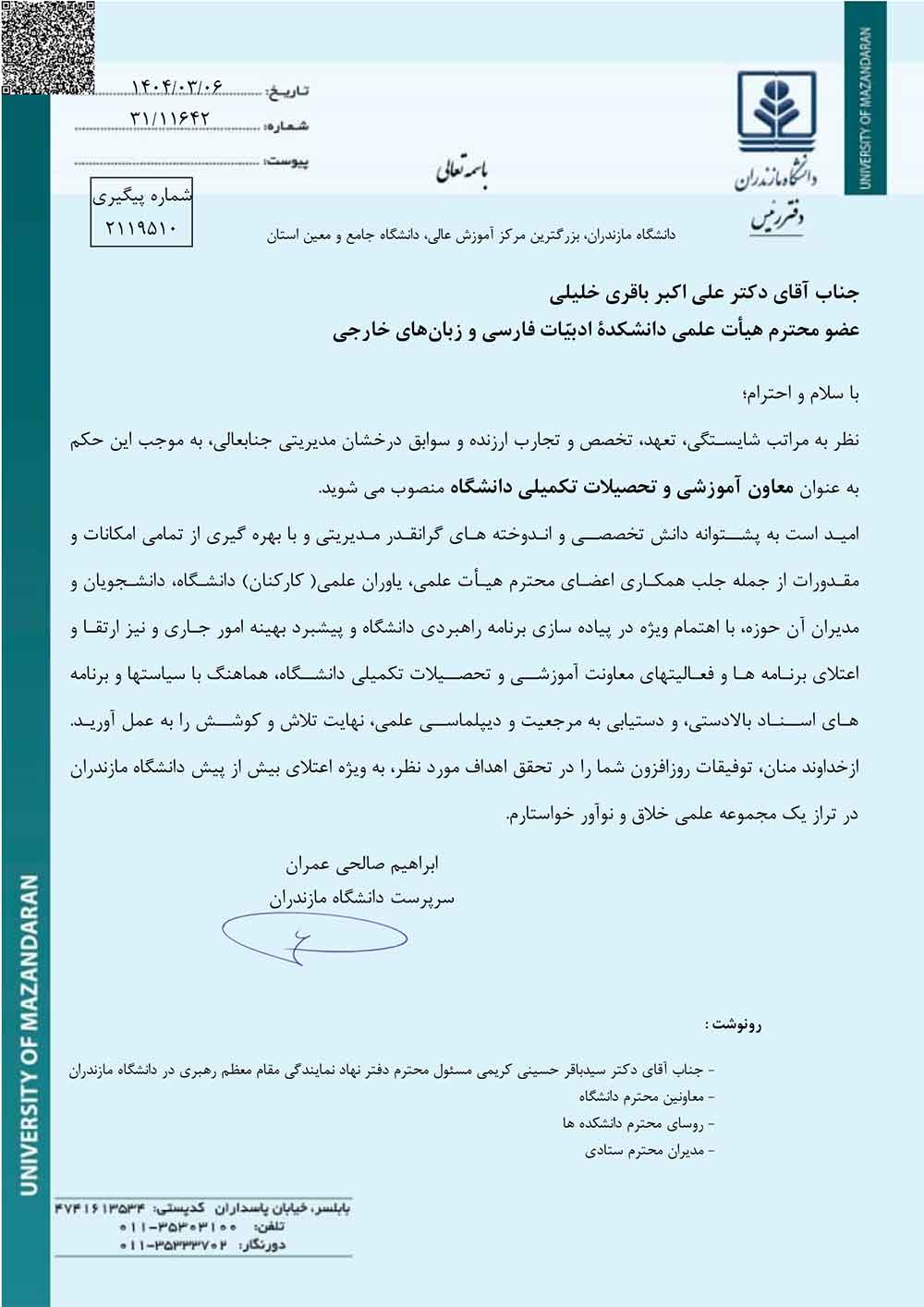 به گزارش روابط عمومی دانشگاه مازندران، دکتر ابراهیم صالحی عمران سرپرست دانشگاه، با صدور احکام جداگانهای، دکتر علیاکبر باقری خلیلی عضو هیات علمی دانشکده ادبیات فارسی و زبانهای خارجی، دکتر یحیی طالبی رستمی عضو هیات علمی دانشکده علوم ریاضی و دکتر امامعلی شعبانی عضو هیات علمی دانشکده علوم انسانی و اجتماعی را به ترتیب بهعنوان معاون آموزشی و تحصیلات تکمیلی، معاون اداری، مالی و پشتیبانی و معاون دانشجویی دانشگاه مازندران منصوب کرد.