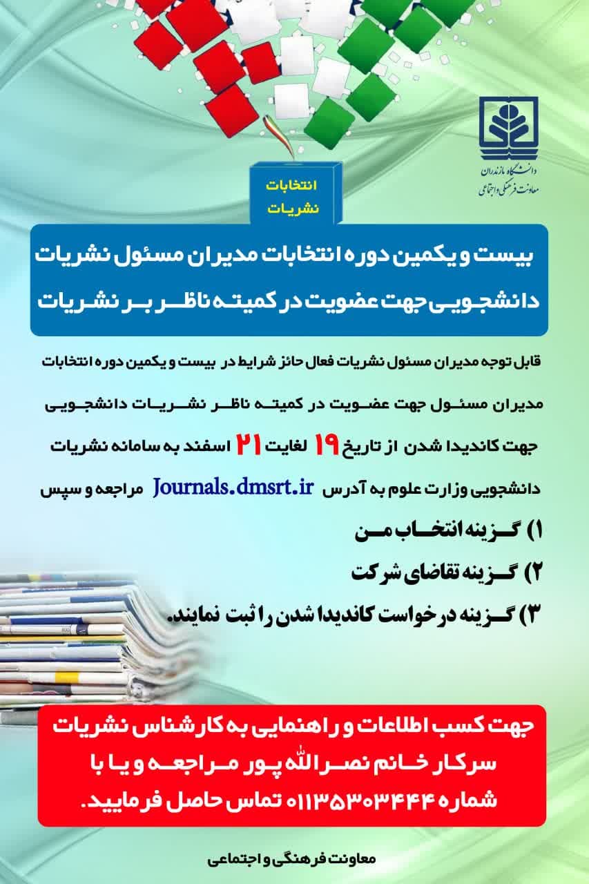 بیستویکمین دوره انتخابات مدیران مسئول نشریات دانشجویی جهت عضویت در کمیته ناظر بر نشریات - دانشگاه مازندران