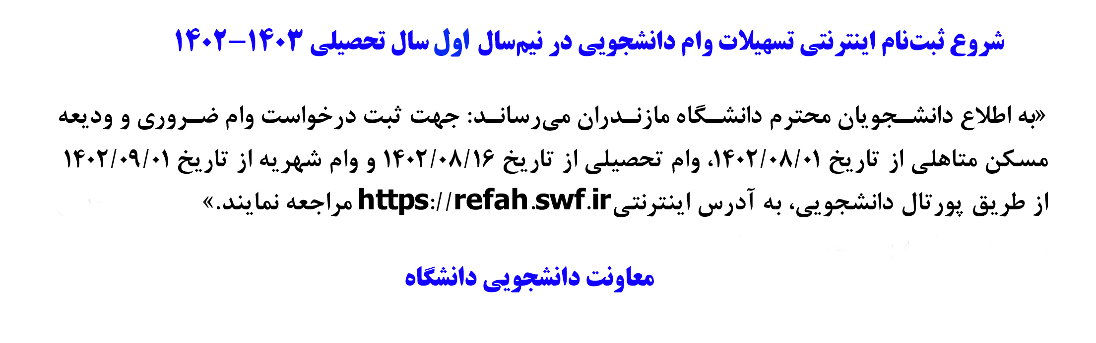 شروع ثبتنام اینترنتی تسهیلات وام دانشجویی در نیمسال اول سال تحصیلی 1402-1403 - دانشگاه مازندران