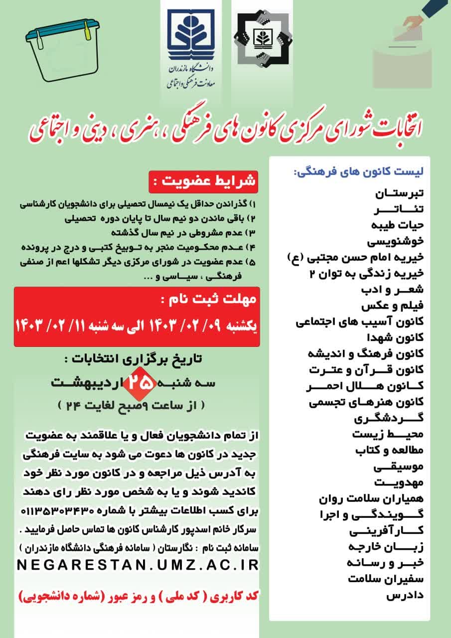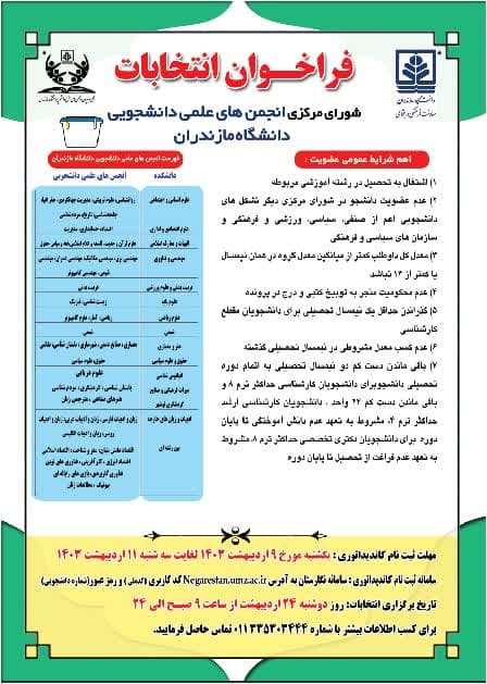 فراخوان انتخابات شورای مرکزی انجمنهای علمی و کانونهای فرهنگی، هنری، دینی و اجتماعی دانشجویی - دانشگاه مازندران